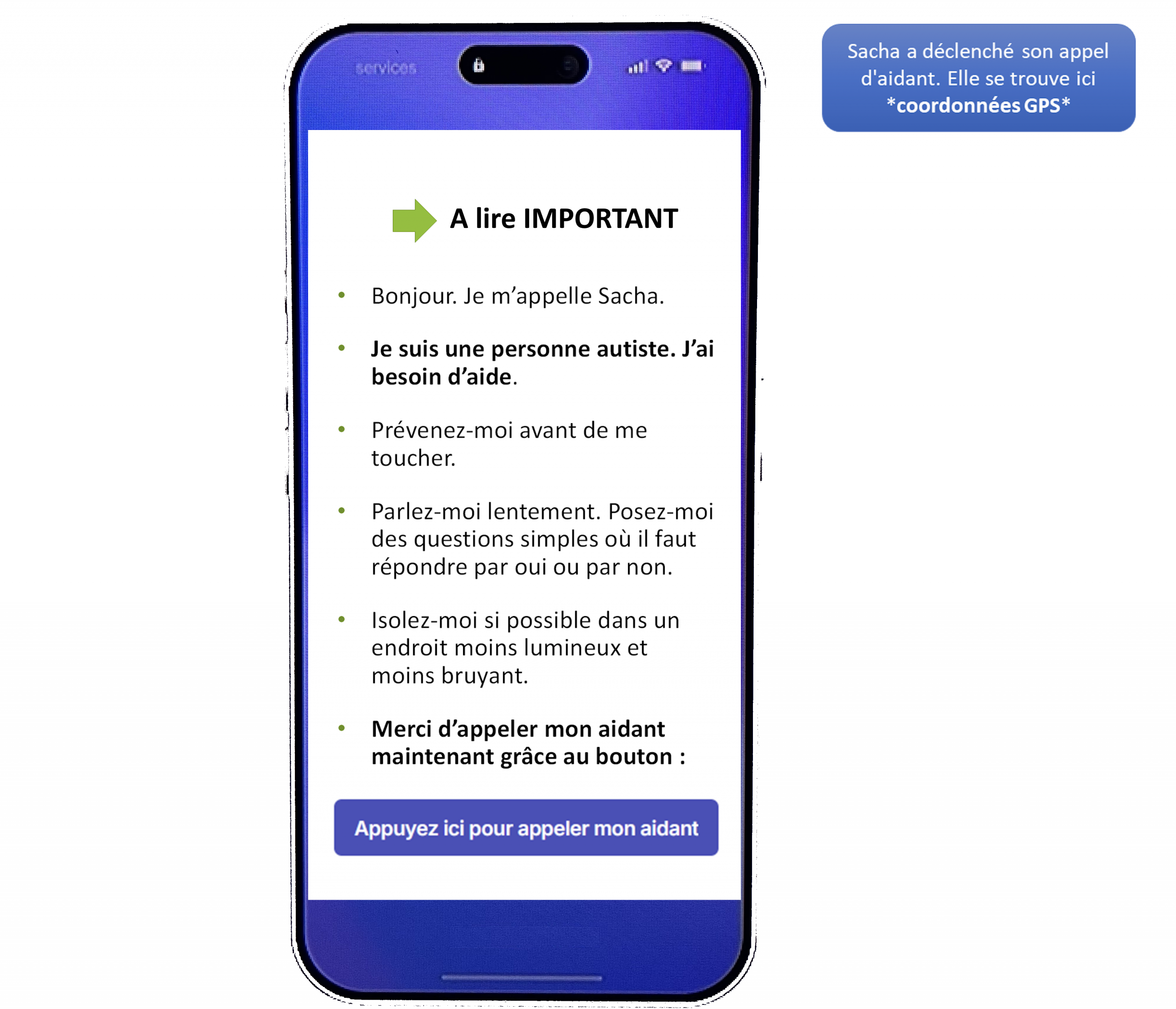 - En version béta, pour les premiers utilisateurs, le qr-code permettra la géolocalisation sans abonnement et un bouton d’appel de l’aidant sur l’écran.